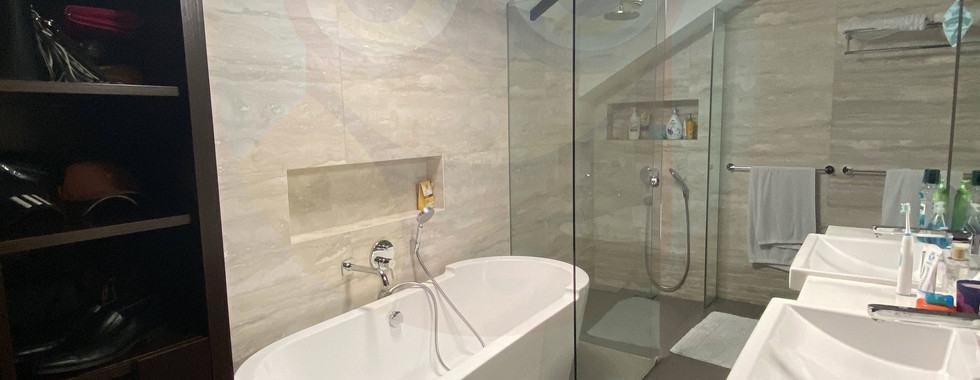Located up on the newly created 3rd storey, the Master Bedroom is located under the existing sloping roof and gets its daylight and ventilation by overlooking the existing courtyard. As it does not have windows out towards the front, it enjoys a high level of privacy and yet still connected with the outdoors as it is just adjacent to the roof terrace which looks out towards the hustle and bustle of Orchard Road not far away. True to the nature of cosmopolitan living, the Master Bathroom oozes luxury and sophistication with the employment of rustic looking silver travertine marble from top to toe on the bathroom walls.